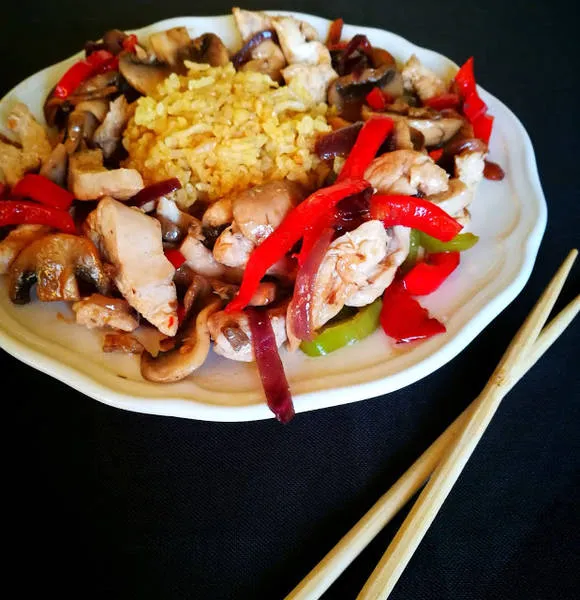 Пържено пиле с ориз и зеленчуци