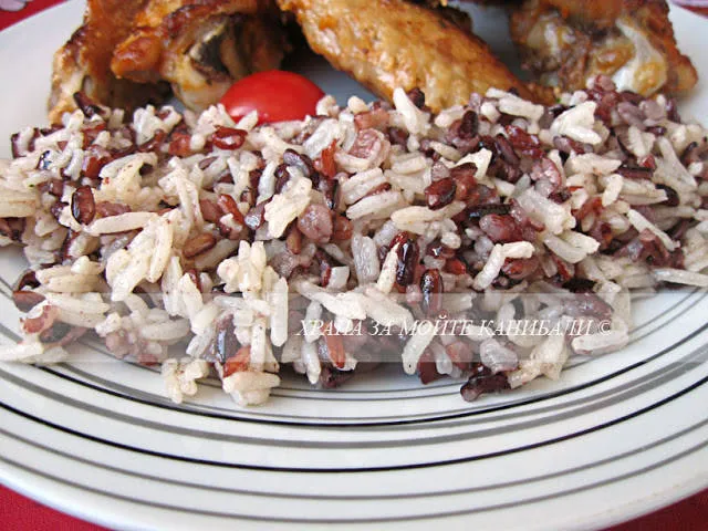 Пилешко и свинско месо, и кърначе върху канапе от ориз със зеленчуци