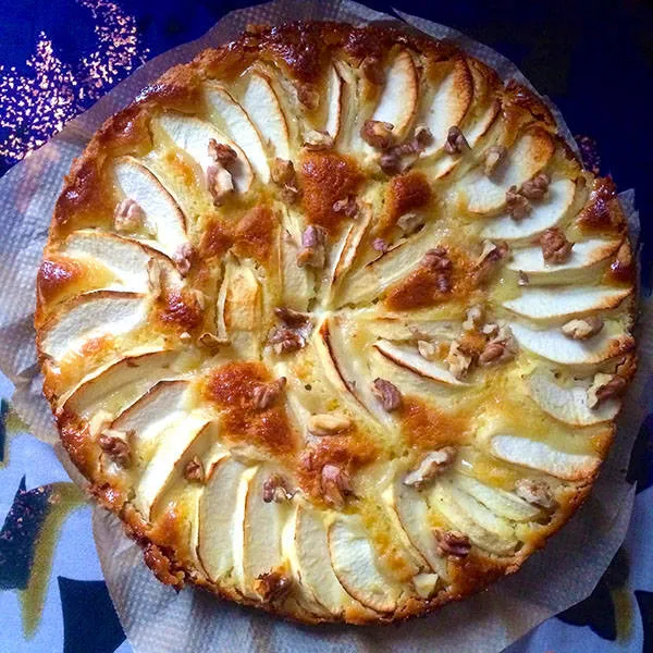 Лека основа за кейк с глазура от карамелизиран марципан, сочни, разтапящи се ябълки с лека загадка на вкус на лимон и приятен хрупкав контраст на печени орехи – божествена комбинация.