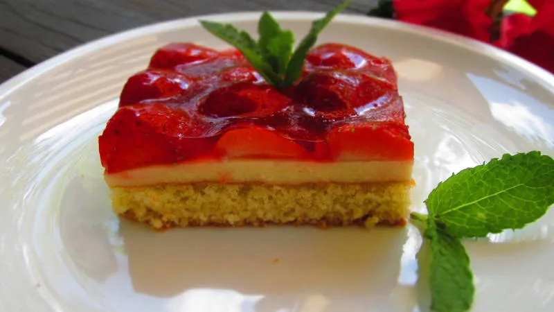 Съчетание на вкусен блат, ванилов пудинг и желирани ягоди!