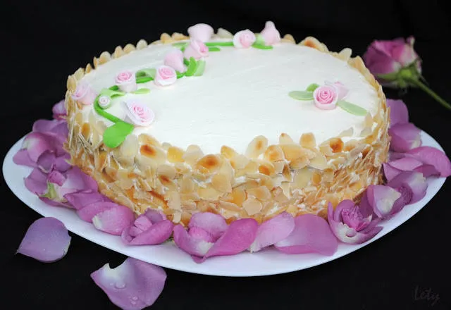 Украсата на тортата е по ваше желание. Тк: отгоре - цветя от готова моделираща маса, отстрани за борда на тортата - филирани бадеми, за чинията - откъснати от цвета листенца на роза.