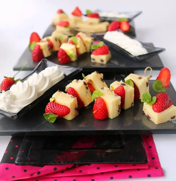 Сладки шишчета от бисквитени чийзкейк кубчета, ароматни ягоди, свежа мента и шамфъсък