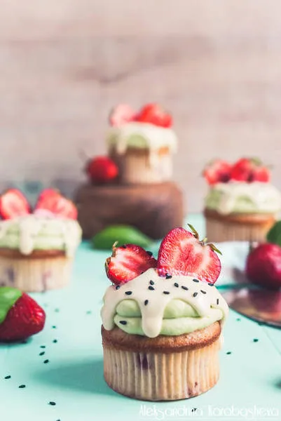 Сладурски къпкейкс с ягоди, глазура от крема сирене и матча, с бял шоколад и черен сусам.
