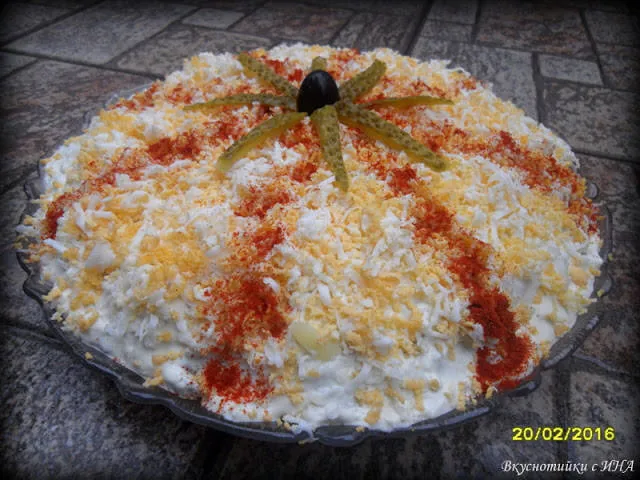 Една разкошна салата, съчетала в себе си апетитен яйчено-млечен сос и варени картофки Една салата поднесена по оригинален начин