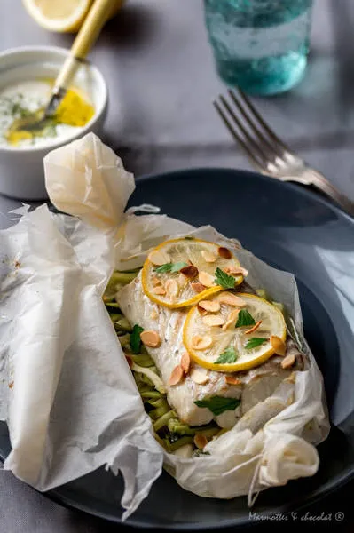 Филе от бяла риба, с тиквички, лимон и бадеми. При сервиране, пакетите се отварят и се поръсват с малко филирани бадеми. Може да се поднесе със сос от кисело мляко, копър, лимон и зехтин.