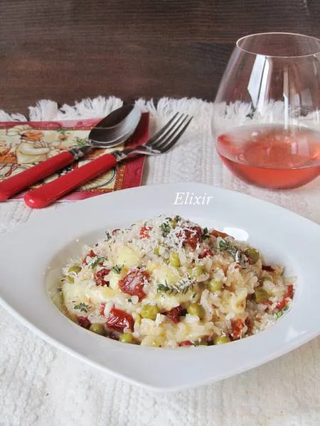 Ризото с грах,сушени домати и скаморца
