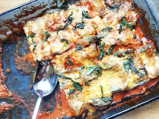 Рулца от патладжани със сирена и босилек върху доматен сос