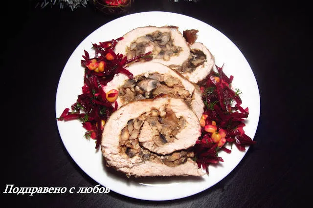 Руло от свинско месо на фурна с плънка от карамелизиран лук, орехи и гъби