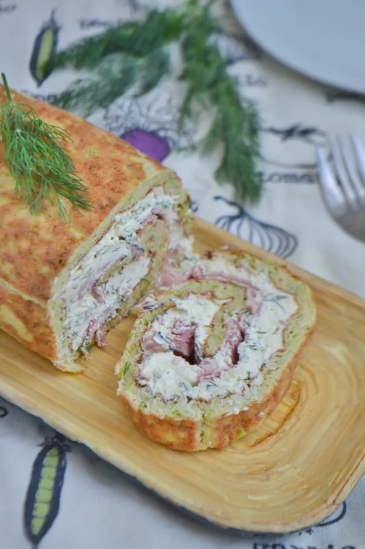 Леко, ефирно и много вкусно руло от тиквички с пълнеж от крема сирене и шунка