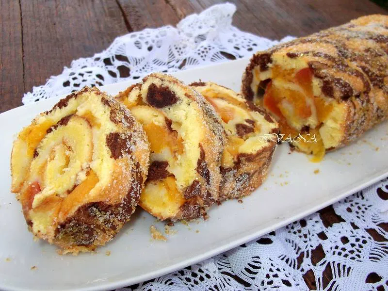 Пандишпан, меки и сочни праскови - резултата вкусно плодово руло!