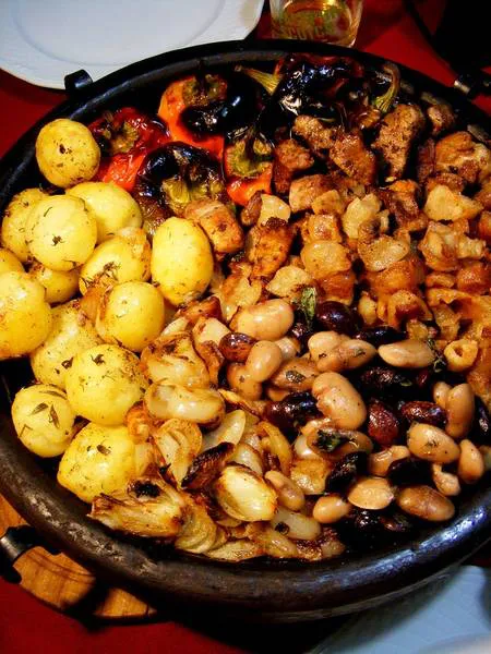 Сач със свинско, пръжки и зеленчуци