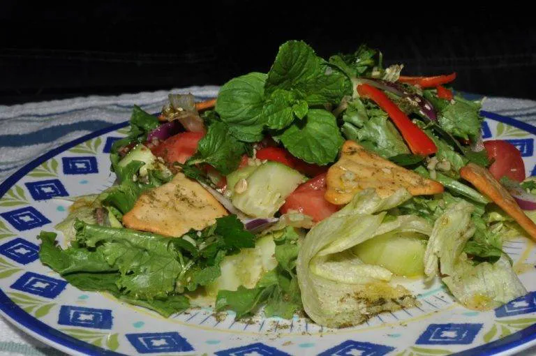 Fattoush salad - традиционна ливанска салата, колоритна, освежаваща, хрупкава и пълна с вкус. Прави се с грубо нарязани зеленчуци и билки, препечен или пържен арабски хляб и сладко-кисел дресинг
