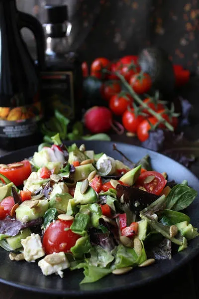 На пръв поглед това е една доста богата салата с микс от свежи зеленолистни и зеленчуци. Това, което я отличава от другите обаче е дресинга