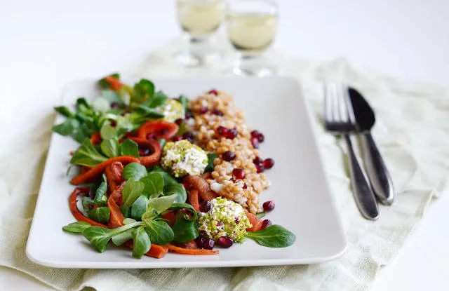 В подходяща чиния се подрежда измития и подсушен спанак, морковите, лимеца и топчетата от козе сирене. Салата се поръсва със семената от нар и се овкусява с медения дресинг.