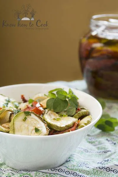 Подготовка на тази салата от тиквички и сушени домати е малко по-дълга, защото е необходимо предварително да изпечете тиквичките, но усилията си заслужават