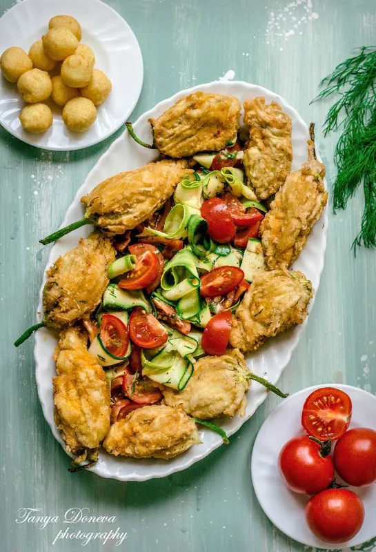 Салата от тиквички с гарнитура от панирани, пълнени тиквени цветове