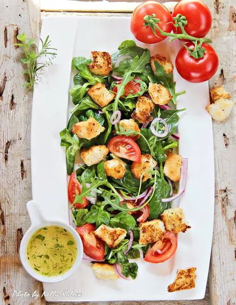 Акцентът в моя вариант пада върху вкусния дресинг и ароматните препечени парчета хляб. С добавка на малко печено с мед и орехи сирене или топка моцарела, тя може да се превърне в чудесен пролетен обяд или вечеря.