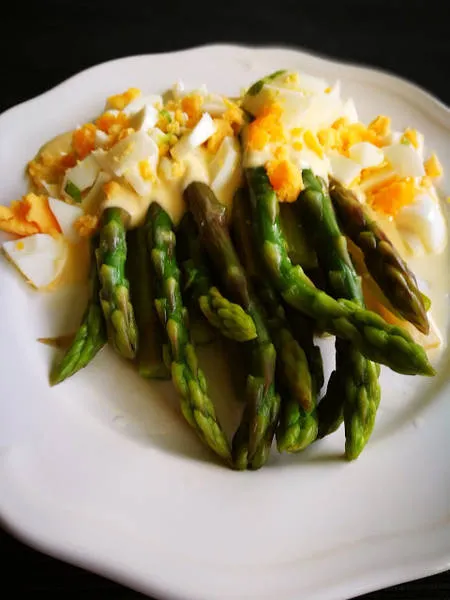 Подредете аспержите в чиния, залейте ги със соса и поръсете с нарязаните на ситно сварени яйца.