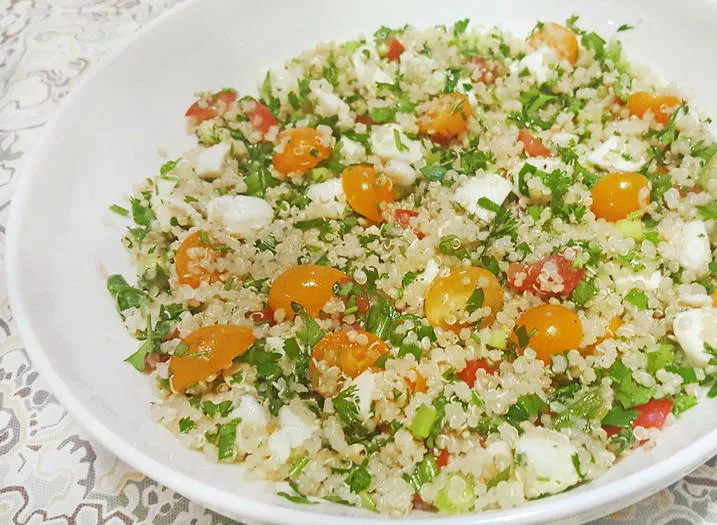- 2 големи домата, почистени от семената и воднистата част и нарязани на малки кубчета или 1ч.ч чери доматчета, нарязани на половинки