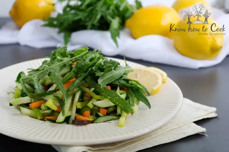 Тази семпла салата има много богат вкус. Силният, леко горчив вкус на руколата се съчетава със сладостта на моркова, нежността на краставицата и зелената чушка. Маслините пасват идеално. Свежият лимонов дресинг с копър е перфектният завършек