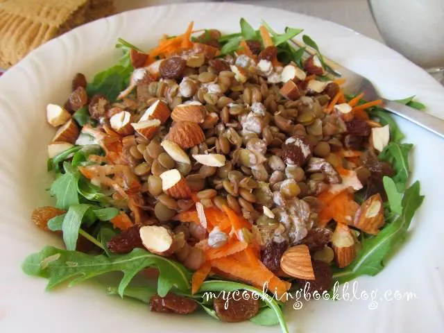 Специфичният вкус на лещата по чуден начин се слива с пиперливата рукола, сладостта от морковите и стафидите и хрупкавите бадеми.