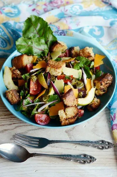 Салата с листа от червено цвекло, круши и ментово песто