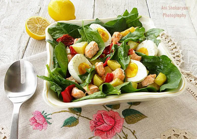 Съдържа печена Норвежка сьомга, печени пресни картофки, печени червени чушки и сушени домати. Поднесете я полята с млечно-чеснов дресинг и ще останете очаровани.