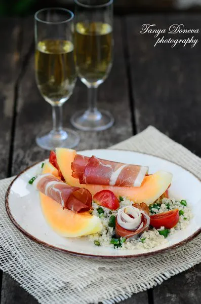 Сервирайте по две парчета пъпеш за всяка порция, половината от кус-куса и няколко парчета прошуто.