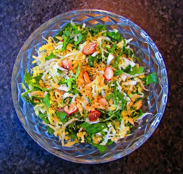 Салата със спанак, китайско зеле и чипс от ролца от раци