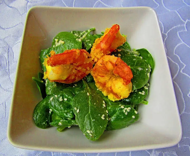 Салата със спанак, скариди темпура и медено-горчичен дресинг