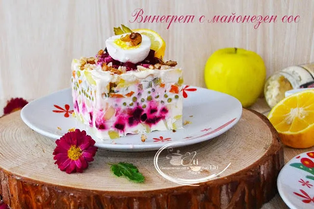 Има много варианти на тази салата от гледна точка на добавени зеленчуци и (или) месо..., с и без майонеза, но винаги с червено цвекло