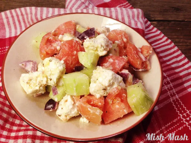 Опитайте тази вкусна и ароматна салата с домати, краставици, червен лук и сирене. Наглед няма нищо необичайно, но тайната е в дресинга.