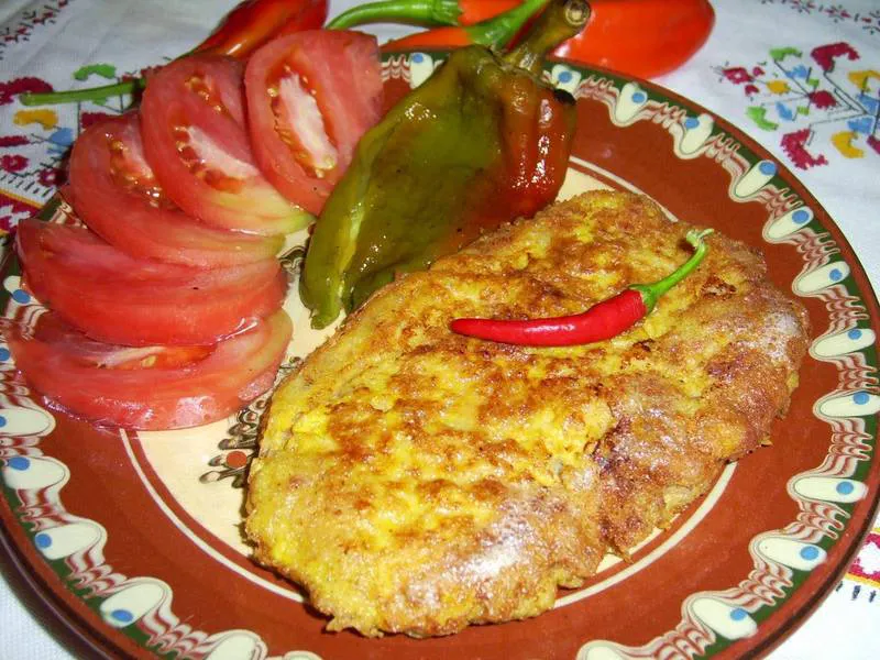 - Лукът се настъргва на ситно. Смесват се всички продукти, като подправките, които слагате може да са различни - по ваш вкус. Всичко се омесва добре. Разделя се на осем части, които се оформят като шницели с мокри ръце. Всеки шницел се поставя върху парче найлоново фолио. Подреждат се един върху друг, заедно с фолиото - по този начин не се залепват и се слагат за около час - час и половина във фризера. Яйцата за панировката се разбиват. Всеки шницел внимателно се отделя от фолиото и се овалва в галета, след което се потапя в яйцата. Пържи се в добре загрята мазнина до златисто.