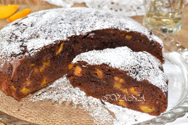 Сочен и ароматен шоколадов сладкиш с праскови и ром