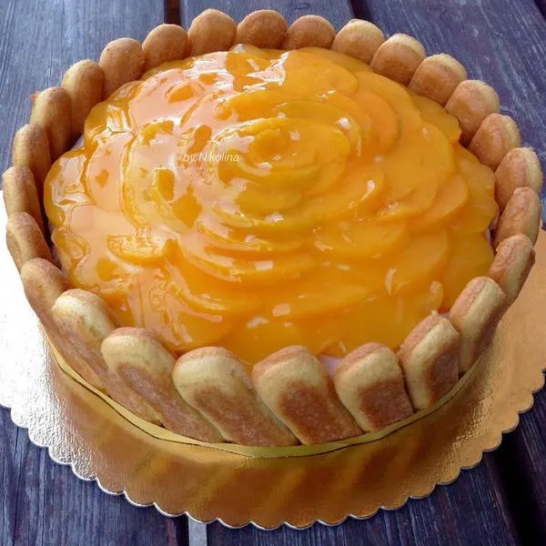 - Покрива се с другия блат, който също се сиропира и намазва с останалия крем. Декорира се с прасковите,