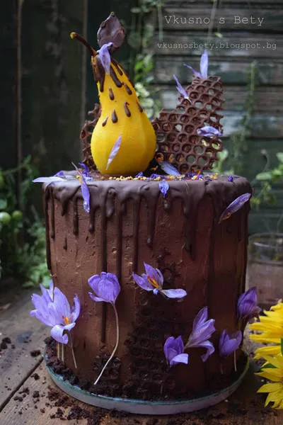 Шоколадова торта с круши, стафиди и сушени сини сливи