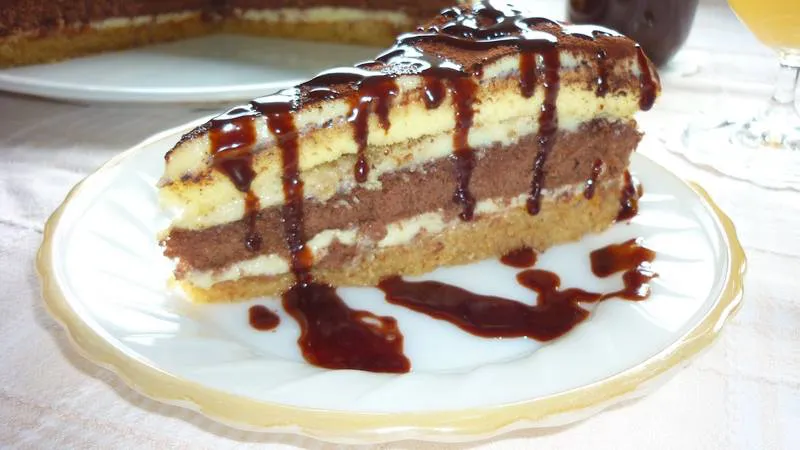 Облян в ром, покрит с яйчен крем, гарниран с кайсиево сладко, орехи и стафиди, поръсен с какао и плуващ в шоколад (и бита сметана).