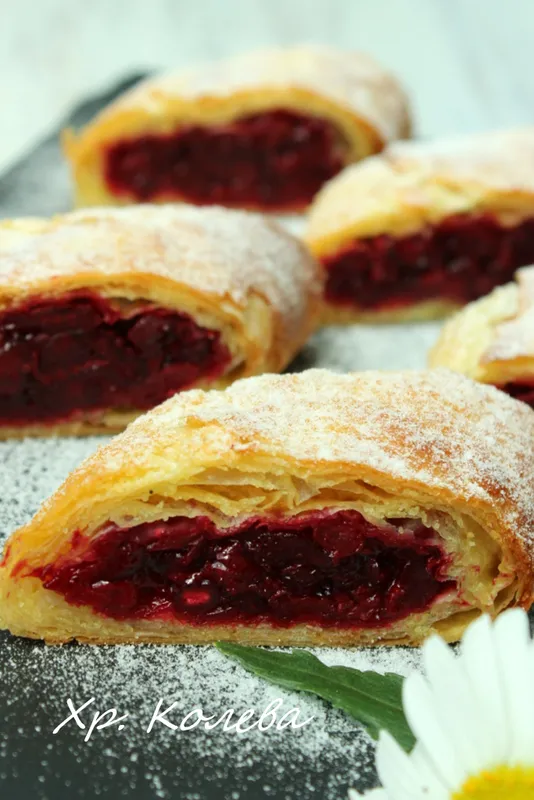 Хрупкав с ароматна плънка. Може да се приготви и с череши