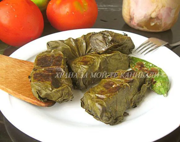 - * Нарежда се върху лозов лист, върху него парче домат със същите размери и една стиска ситно нарязан лук