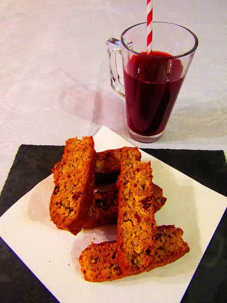 На вкус са като кантучини. Рецептата позволява различни варианти с любими плодове и ядки, стига да се спазва общото количество на сухите подправки.