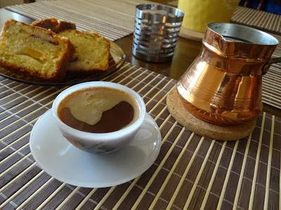 Ароматен и вкусен сладкиш с праскови и канела....и гръцко кафе. Става бързо и свършва бързо.