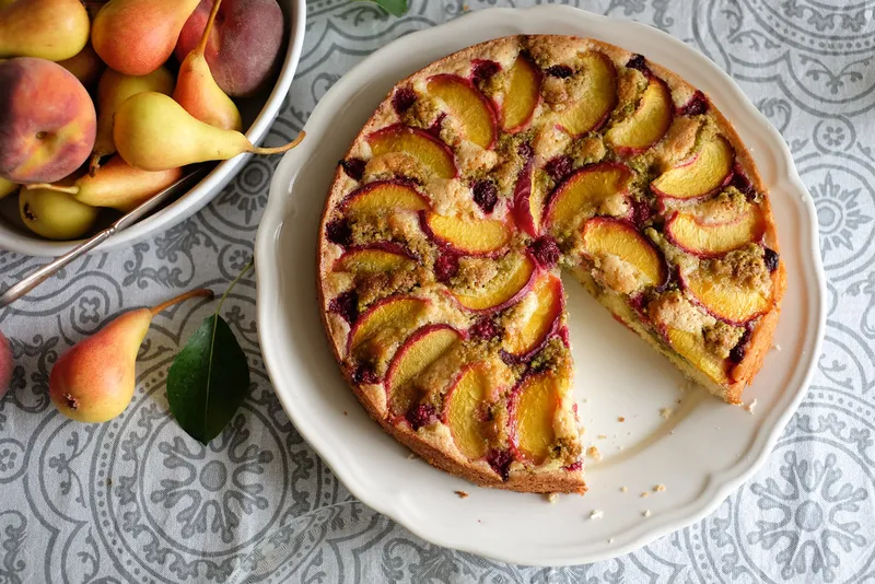 Сладкиш с праскови и малини и франжипан от шамфъстък