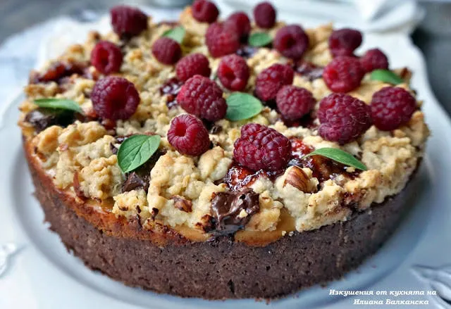 Сладкиш с рикота, шоколад и малини с хрупкава лешникова коричка