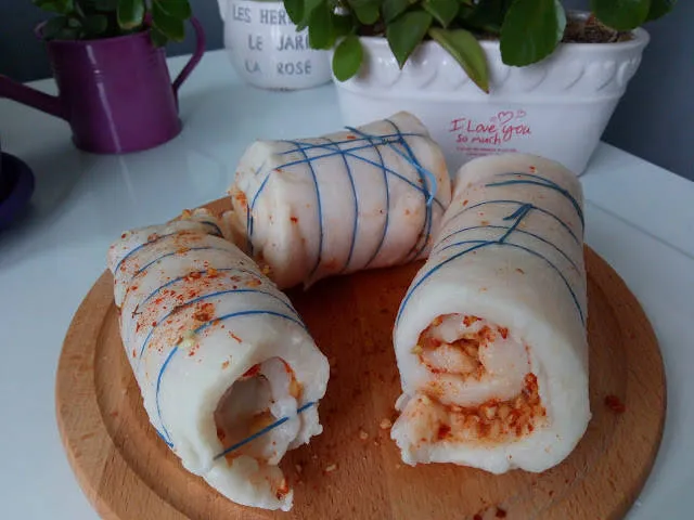 Домашната сланина си е деликатес, ако се хапва умерено. Рулата се овкусяват със смес от пасиран чесън,смлени орехи,лют червен пипер на люспи и малко копър