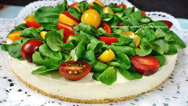 Преди сервиране чийзкейка се гарнира със свежа градинска салата и чери домати и се полива със струйка зехтин.