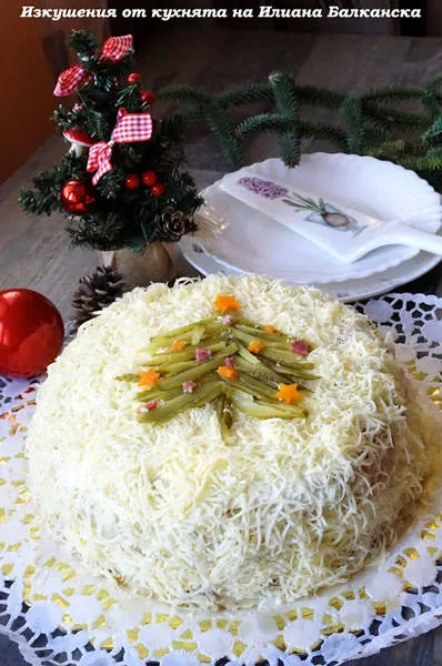 Тортата се измазва с майонеза и се покрива цялата с настърган кашкавал. Декорира се по желание. Украсата ще създаде настроение на Коледната трапеза