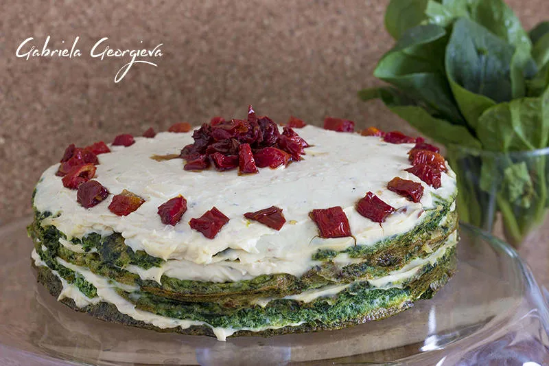 Пролетна спаначена торта, обилно намазана с топено сирене