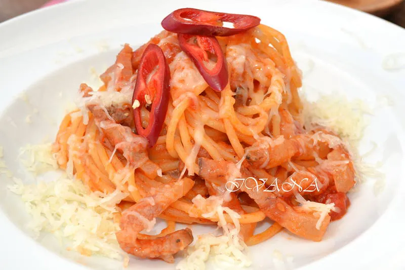 Спагети с пушен бекон, доматен сос и пекорино! Една от най-известните пасти!