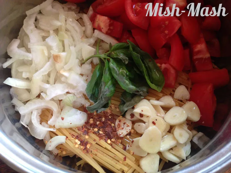 Вегетариански спагети с наситен чеснов аромат за по-малко от 15 минути!!! Слагаш всичко накуп, бъркаш и после дори не се налага да отцеждаш от водата! По-хубаво от това просто няма накъде!
