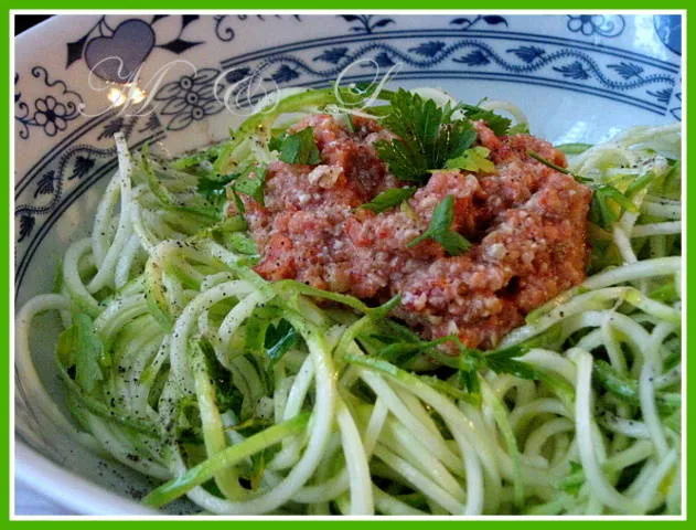 Спагети от тиквички със сос от червена чушка и сушени домати